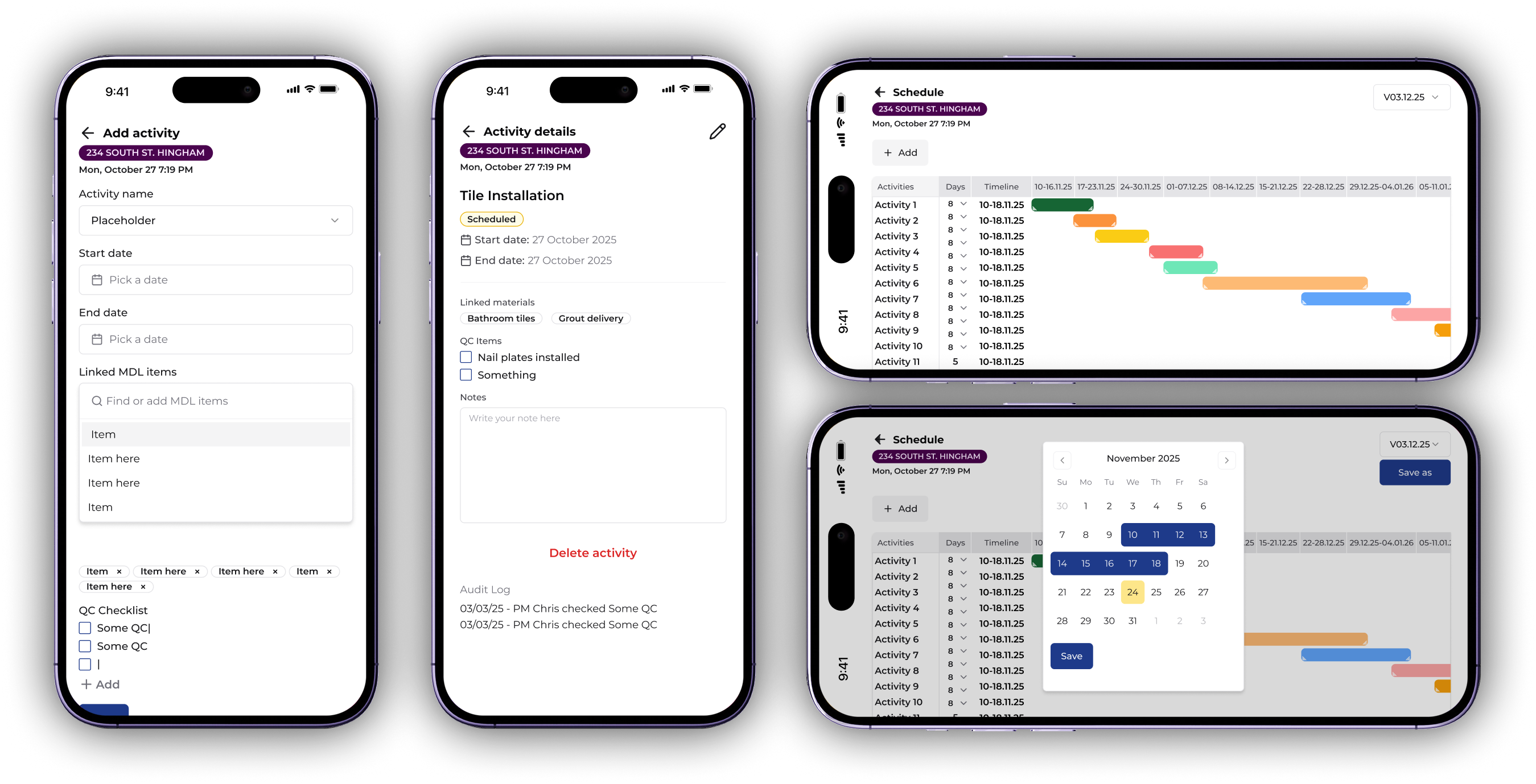 „Графикът" е централен инструмент за планиране и проследяване на всички дейности по строителния проект на едно място. Той показва задачите по дати в ясен седмичен изглед, като позволява на изпълнителите да ги управляват и актуализират, а на клиентите – да следят напредъка. Чрез него екипите поддържат яснота, координация и контрол върху изпълнението на проекта.